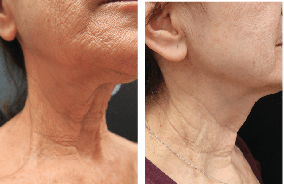 New lasers such as the 650 microsecond Nd:YAG device (Lightpod Neo) with its high energy and short pulse duration can tighten skin of the jowls, neck, and decollete area in several short treatments. Innovative monopolar radiofrequency technologies with new, large and flexible applicators not only tighten skin but also reduce fat non-invasively (TempSure Firm). Micro-focused ultrasound has been available for some time, but there are now combinations of RF and ultrasound to reduce skin laxity (Exilis Ultra). These non-invasive approaches are effective but often require multiple sessions to achieve the benefits.
