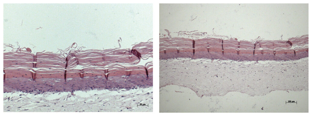 Figure 1 Histological analysis of 3D skin models stained with Hematoxylin and Eosin (H&E). Panels show cross-sections of reconstructed human skin equivalents, highlighting the epidermal and dermal architecture.