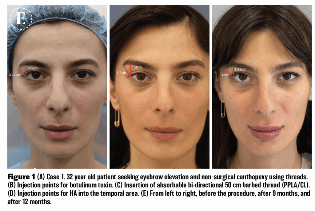 Patient: 32 years old, seeking eyebrow elevation and non-surgical canthopexy using threads (Figure 1A).