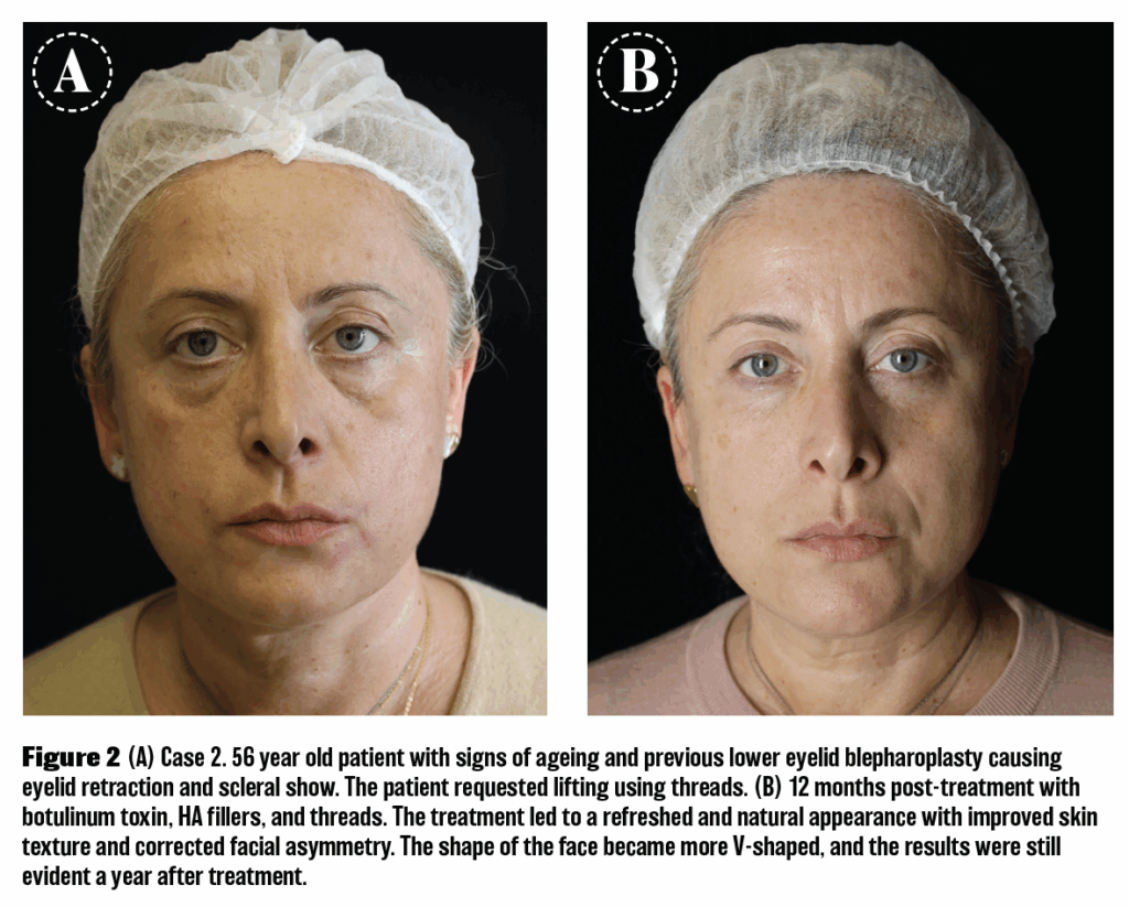 Patient: 56 years old, with signs of ageing and previous lower eyelid blepharoplasty causing eyelid retraction and scleral show. The patient requested lifting using threads (Figure 2A).